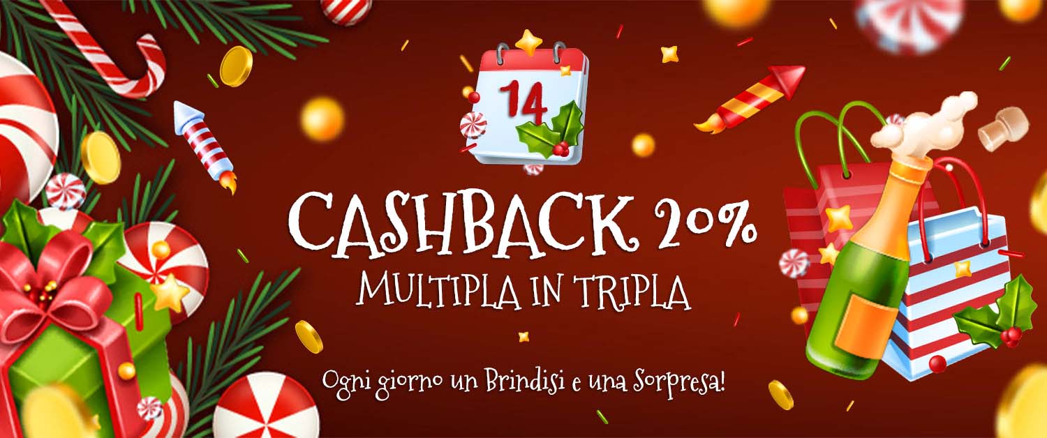 Dalle ore 08:00 fino alle 23:59 di 14 dicembre per te l'offerta TRIPLA CASHBACK 20% .Gioca in MULTIPLA (TRIPLA 3eventi) se la tua scommessa risulterà perdente a causa di UN SOLO PRONOSTICO ERRATO, riceverai un BONUS PARI AL 20% DELLA GIOCATA, minimo di 1€ fino a un massimo di 10 euro.