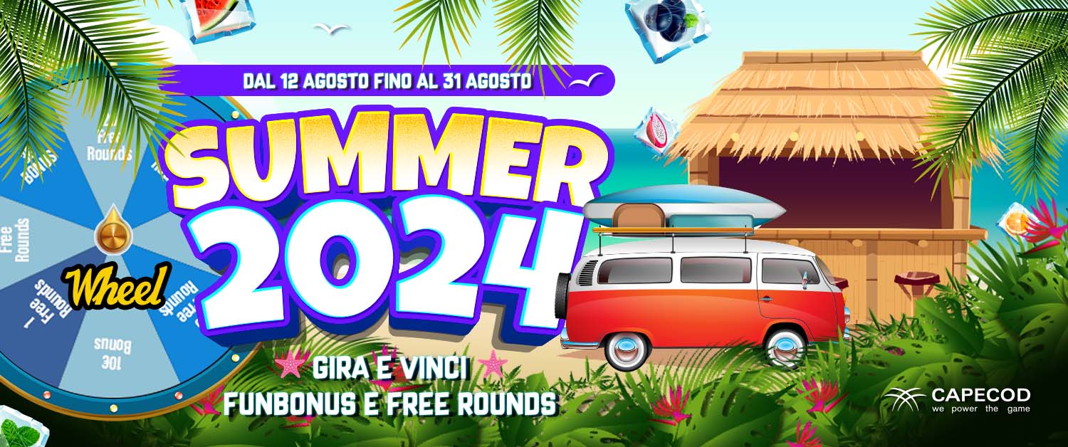 Dal 12 Agosto al 31 Agosto Capecod lancia la super Promo Summer 2024 Wheel tutti i giorni della Summer 2024 hai la possibilità di girare la Ruota e vincere FREESPIN o FUNBONUS da Giocare sulle Slot di Capecod! Cosa stai aspettando tenta la fortuna, e se non vinci oggi vincerai domani.
