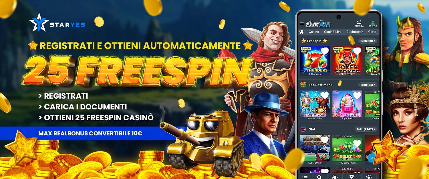 Crea un account Staryes.it, carica I documenti e ottieni in automatico 25 Freespin da poter giocare sui nostri Casinò! Le vincitè ti saranno accreditate come “Funbonus Casinò” da convertibili in Realbonus nella categoria slot Funbonus!