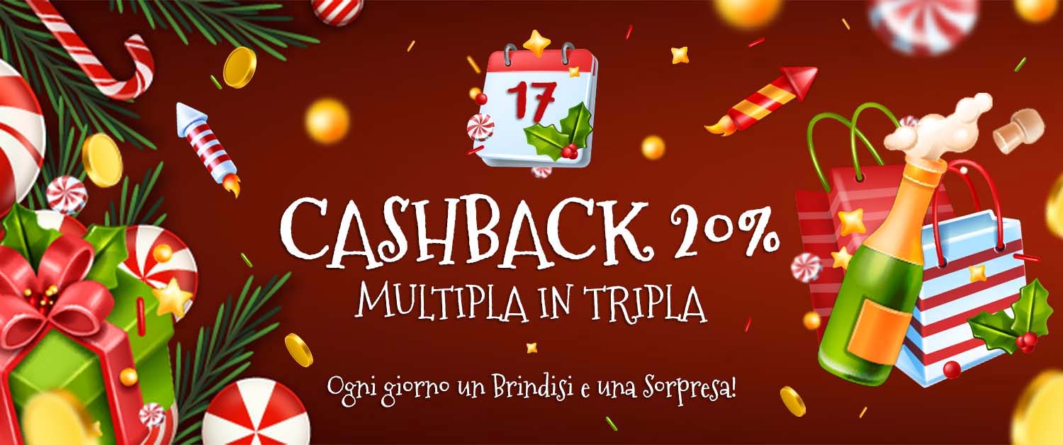 Dalle ore 08:00 fino alle 23:59 di mercoledì 17 dicembre per te l'offerta TRIPLA CASHBACK 20% .Gioca in MULTIPLA (TRIPLA 3eventi) se la tua scommessa risulterà perdente a causa di UN SOLO PRONOSTICO ERRATO, riceverai un BONUS PARI AL 20% DELLA GIOCATA, minimo di 1€ fino a un massimo di 10 euro.
