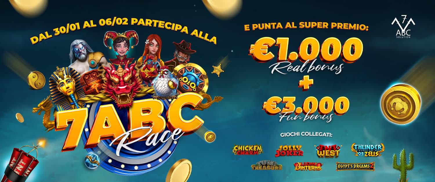 Partecipa alla "SEVEN ABC RACE" dal 30 gennaio al 06 febbraio 2026 e scala la classifica per conquistare il SUPER PREMIO da €1.000 in REAL BONUS distribuito ai primi 50 giocatori.