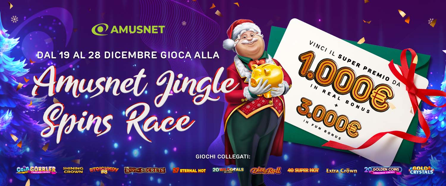Partecipa alla "AMUSNET JINGLE SPINS RACE" dal 19 dicembre al 28 dicembre 2025 e scala la classifica per conquistare il SUPER PREMIO da €1.000 in REAL BONUS.